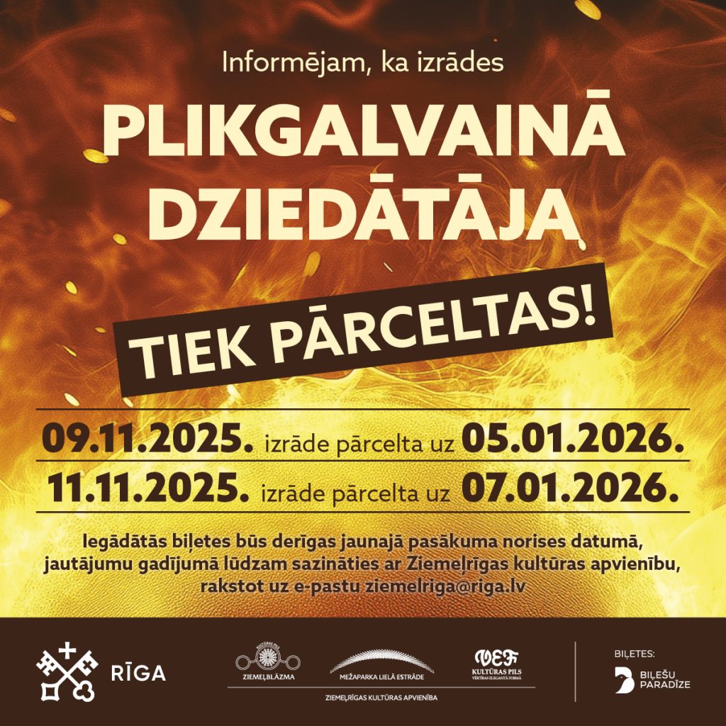 Iegādātās biļetes ir derīgas attiecīgajos pārceltajos datumos. Ja izrādes apmeklējums nav iespējams šajos pārceltajos norises datumos un vēlaties atgriezt naudu par iegādātajām biļetēm, lūgums informēt par to “Biļešu paradīzi”, rakstot uz info@bilesuparadize.lv vai sazinoties ar Ziemeļrīgas kultūras apvienību, rakstot uz ziemelriga@riga.lv.